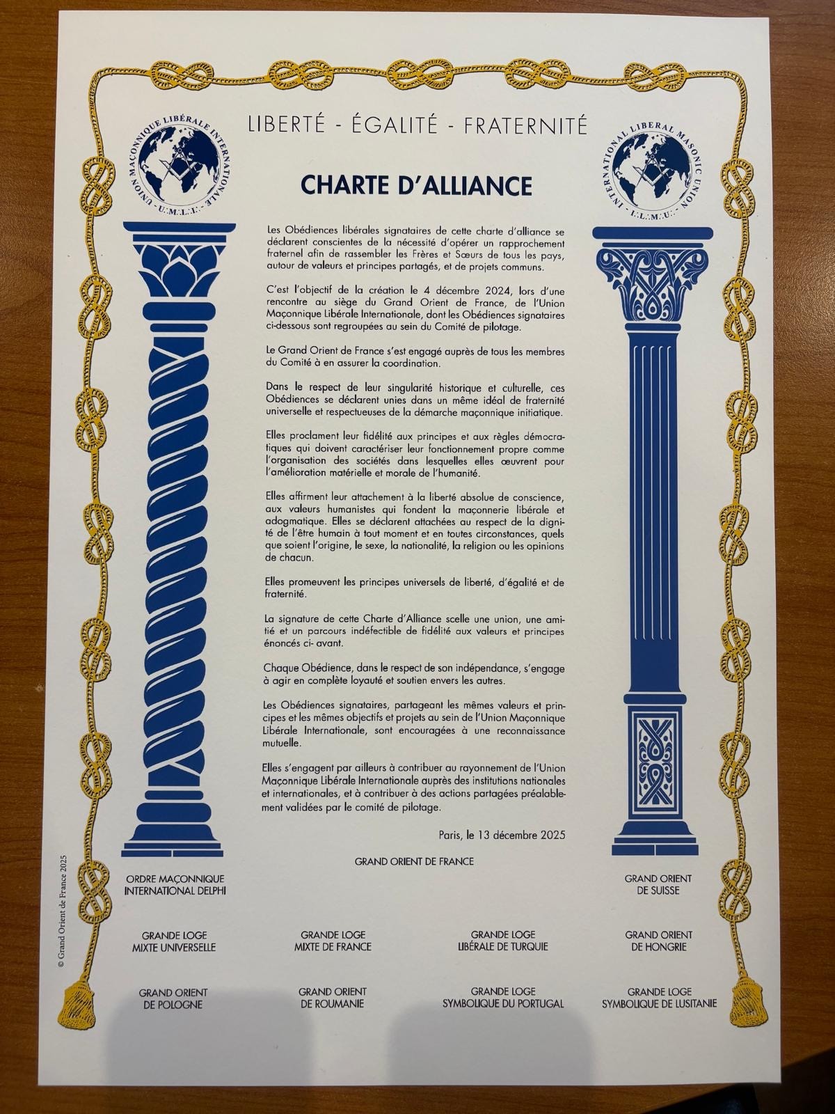 Bei dieser Gelegenheit versammelten sich elf liberale maurerische Obödienzen, um eine neue internationale Allianz zu gründen, die auf gemeinsamen Werten, gelebter Brüderlichkeit und dem Willen basiert, die Zusammenarbeit souveräner Obödienzen zu stärken und gleichzeitig deren Eigenständigkeit und Besonderheiten zu respektieren.